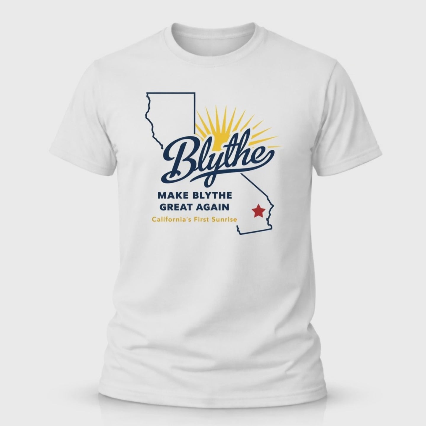 This design captures what makes Blythe different. That early desert glow, the quiet mornings, and the pride of a town that doesn’t try to be anything it’s not. Featuring a bold script “Blythe” over a rising sun and California outline, this shirt is built for locals who know exactly why this place matters.